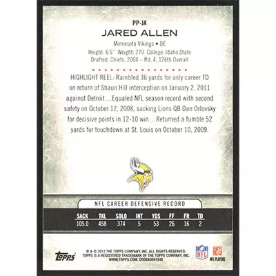 This is a 2012 Topps Prolific Playmakers Jared Allen football card. The card is #PP-JA and pictures show condition.