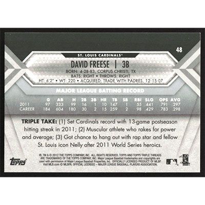 This is a 2012 Topps Triple Threads David Freese baseball card. The card is #48 and pictures show condition.