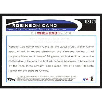 This is a 2012 Topps Update Robinson Cano All-Star baseball card. The card is #US120 and pictures show condition.