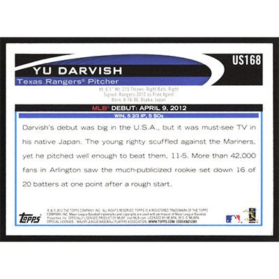 This is a 2012 Topps Update Yu Darvish Rookie Debut baseball card. The card is #US168 and pictures show condition. Team(s): Texas Rangers Rookie Card (RC)