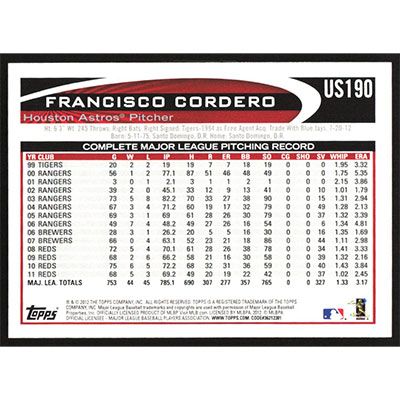 This is a 2012 Topps Update Francisco Cordero baseball card. The card is #US190 and pictures show condition.