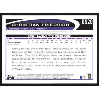 This is a 2012 Topps Update Christian Friedrich baseball card. The card is #US20 and pictures show condition. Team(s): Colorado Rockies Rookie Card (RC)