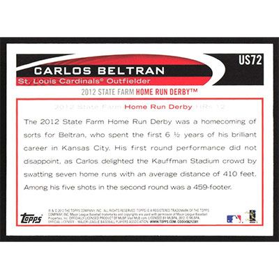 This is a 2012 Topps Update Carlos Beltran Home Run Derby baseball card. The card is #US72 and pictures show condition.