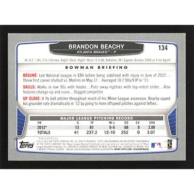 This is a 2013 Bowman Brandon Beachy baseball card. The card is #134 and pictures show condition.