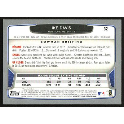 This is a 2013 Bowman Chrome Ike Davis baseball card. The card is #32 and pictures show condition.