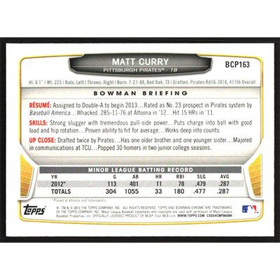 This is a 2013 Bowman Chrome Prospects Matt Curry baseball card. The card is #BCP163 and pictures show condition.