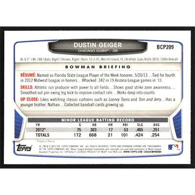 This is a 2013 Bowman Chrome Prospects Dustin Geiger baseball card. The card is #BCP209 and pictures show condition.