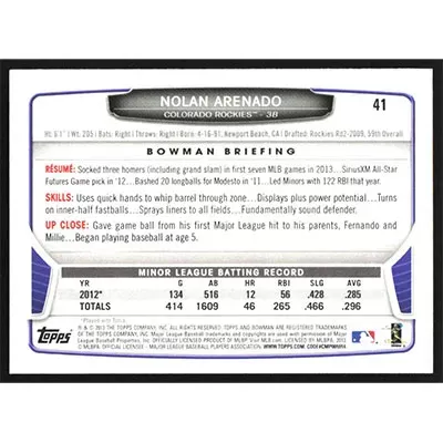 This is a 2013 Bowman Draft Nolan Arenado baseball card. The card is #41 and pictures show condition.
