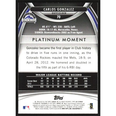 This is a 2013 Bowman Platinum Carlos Gonzalez baseball card. The card is #70 and pictures show condition.