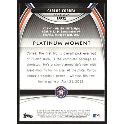 This is a 2013 Bowman Platinum Prospects Carlos Correa baseball card. The card is #BPP23 and pictures show condition.