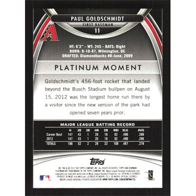 This is a 2013 Bowman Platinum Ruby Paul Goldschmidt baseball card. The card is #11 and pictures show condition.