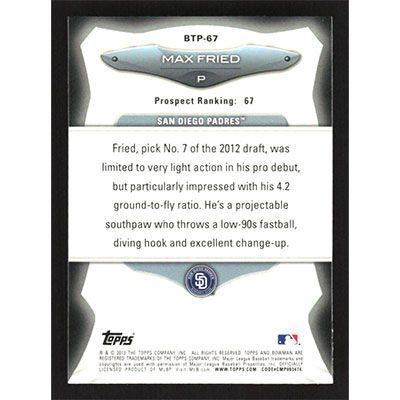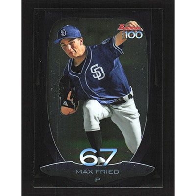 This is a 2013 Bowman Top 100 Prospects Max Fried baseball card. The card is #BTP-67 and pictures show condition.