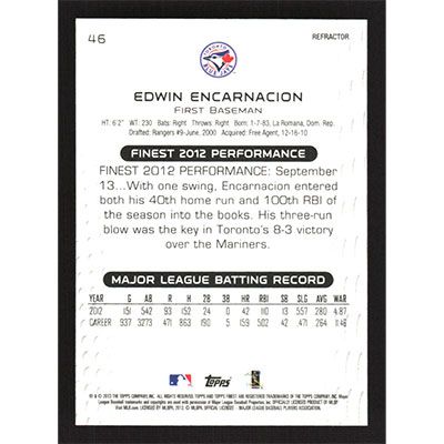 This is a 2013 Finest Refractors Edwin Encarnacion baseball card. The card is #46 and pictures show condition.