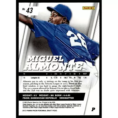 This is a 2013 Panini Prizm Perennial Draft Picks Miguel Almonte baseball card. The card is #43 and pictures show condition.
