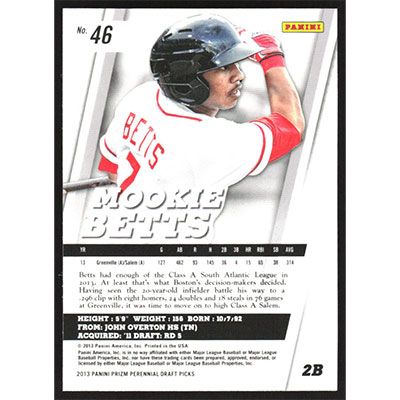 This is a 2013 Panini Prizm Perennial Draft Picks Mookie Betts baseball card. The card is #46 and pictures show condition.