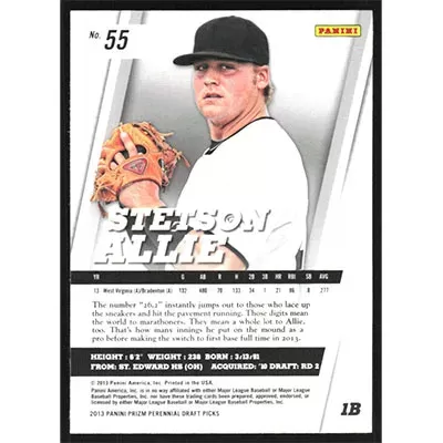 This is a 2013 Panini Prizm Perennial Draft Picks Stetson Allie baseball card. The card is #55 and pictures show condition.
