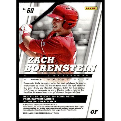 This is a 2013 Panini Prizm Perennial Draft Picks Zach Borenstein baseball card. The card is #60 and pictures show condition.
