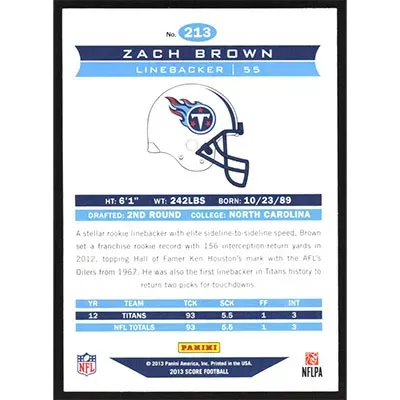 This is a 2013 Score Zach Brown football card. The card is #213 and pictures show condition.