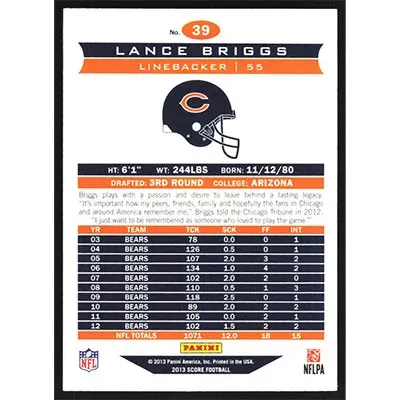 This is a 2013 Score Lance Briggs football card. The card is #39 and pictures show condition.