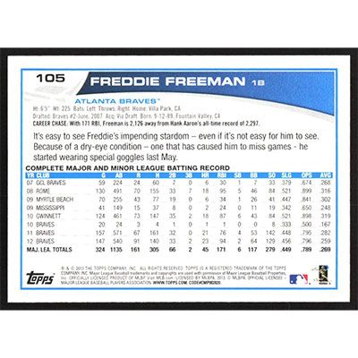 This is a 2013 Topps Freddie Freeman baseball card. The card is #105 and pictures show condition.