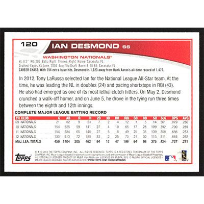 This is a 2013 Topps Ian Desmond baseball card. The card is #120 and pictures show condition.
