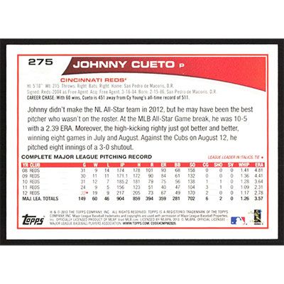 This is a 2013 Topps Johnny Cueto autographed baseball card. This card has been signed, in blue, by Johnny Cueto, and is guaranteed authentic by Ballcardz.com. The card is #275 and pictures show condition.