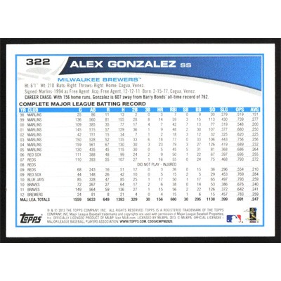 This is a 2013 Topps Alex Gonzalez baseball card. The card is #322 and pictures show condition.