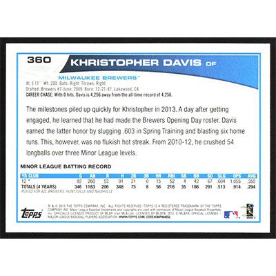 This is a 2013 Topps Khristopher Davis baseball card. The card is #360 and pictures show condition.