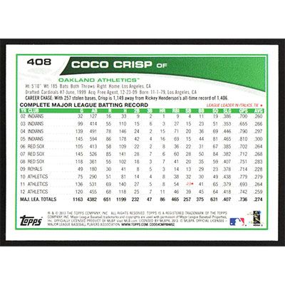 This is a 2013 Topps Coco Crisp baseball card. The card is #408 and pictures show condition.