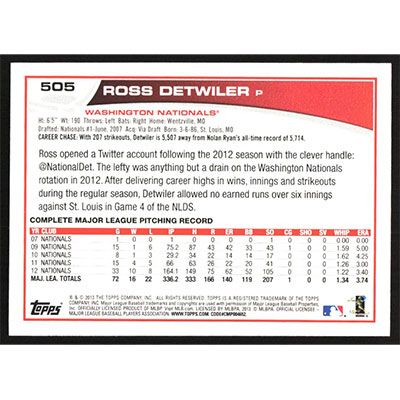 This is a 2013 Topps Ross Detwiler baseball card. The card is #505 and pictures show condition.