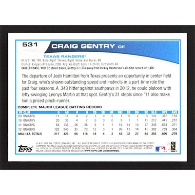 This is a 2013 Topps Craig Gentry baseball card. The card is #531 and pictures show condition.