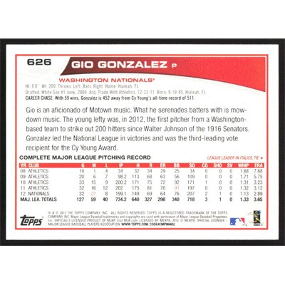 This is a 2013 Topps Gio Gonzalez baseball card. The card is #626 and pictures show condition.