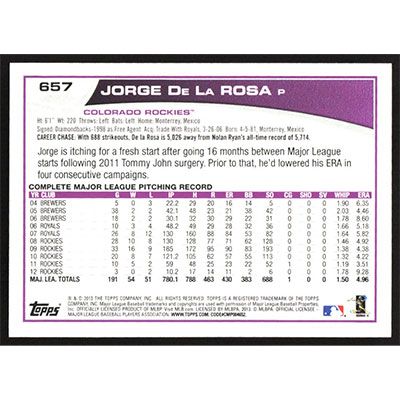 This is a 2013 Topps Jorge De La Rosa baseball card. The card is #657 and pictures show condition.
