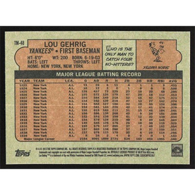 This is a 2013 Topps '72 Minis Lou Gehrig baseball card. The card is #TM-48 and pictures show condition.