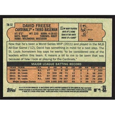 This is a 2013 Topps '72 Minis David Freese baseball card. The card is #TM-52 and pictures show condition.