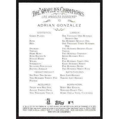 This is a 2013 Topps Allen & Ginter Adrian Gonzalez baseball card. The card is #13 and pictures show condition.