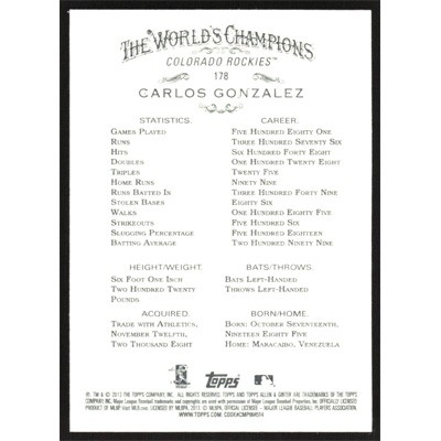 This is a 2013 Topps Allen & Ginter Carlos Gonzalez baseball card. The card is #178 and pictures show condition.