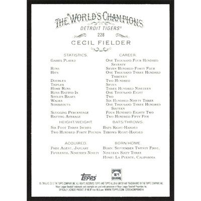 This is a 2013 Topps Allen & Ginter Cecil Fielder autographed baseball card. This card has been signed, in blue, by Cecil Fielder, and is guaranteed authentic by Ballcardz.com. The card is #228 and pictures show condition.