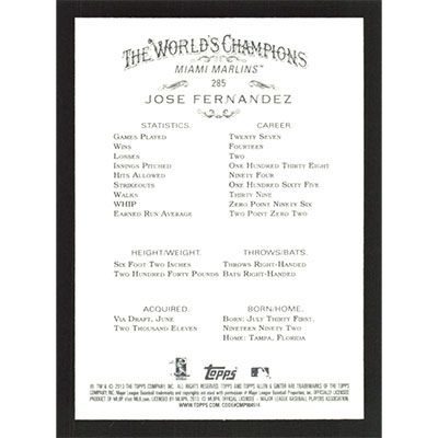 This is a 2013 Topps Allen & Ginter Jose Fernandez baseball card. The card is #285 and pictures show condition. Team(s): Miami Marlins Rookie Card (RC)