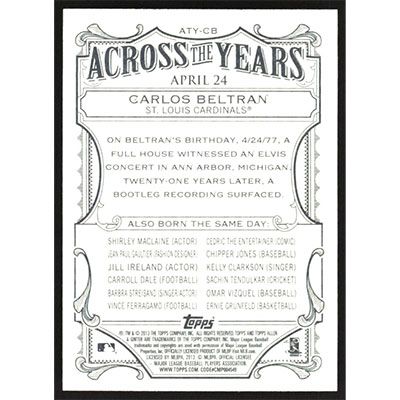 This is a 2013 Topps Allen & Ginter Across the Years Carlos Beltran baseball card. The card is #ATY-CB and pictures show condition. Team(s): St. Louis Cardinals