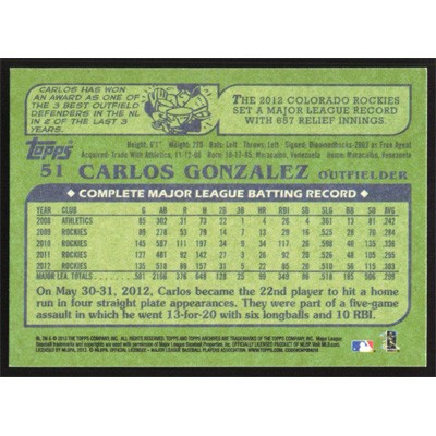 This is a 2013 Topps Archives Carlos Gonzalez baseball card. The card is #51 and pictures show condition.