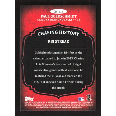This is a 2013 Topps Chasing History Paul Goldschmidt baseball card. The card is #CH-115 and pictures show condition.