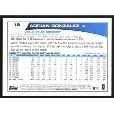 This is a 2013 Topps Chrome Adrian Gonzalez baseball card. The card is #19 and pictures show condition.