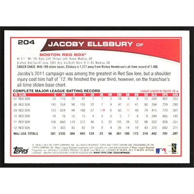 This is a 2013 Topps Chrome Jacoby Ellsbury baseball card. The card is #204 and pictures show condition.