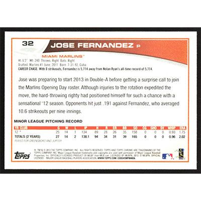 This is a 2013 Topps Chrome Jose Fernandez baseball card. The card is #32 and pictures show condition.