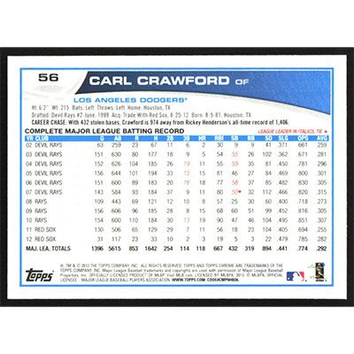This is a 2013 Topps Chrome Carl Crawford baseball card. The card is #56 and pictures show condition.