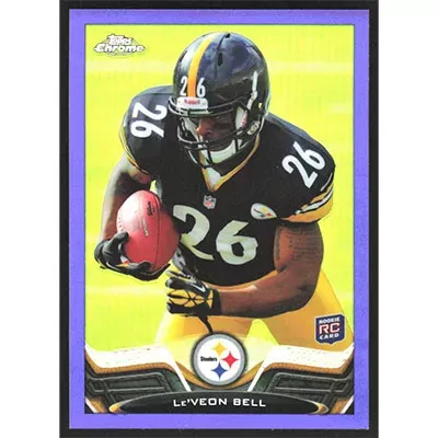 This is a 2013 Topps Chrome Purple Refractors Le'Veon Bell football card. The card is #198 and pictures show condition. This card is limited; #'d 295/499.