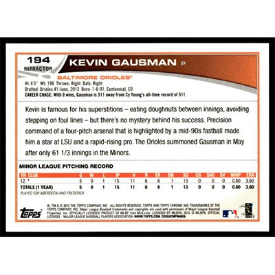 This is a 2013 Topps Chrome Refractors Kevin Gausman baseball card. The card is #194 and pictures show condition. Team(s): Baltimore Orioles Rookie Card (RC)