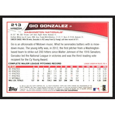 This is a 2013 Topps Chrome Refractors Gio Gonzalez baseball card. The card is #213 and pictures show condition.