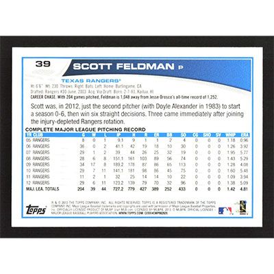 This is a 2013 Topps Emerald Scott Feldman baseball card. The card is #39 and pictures show condition.